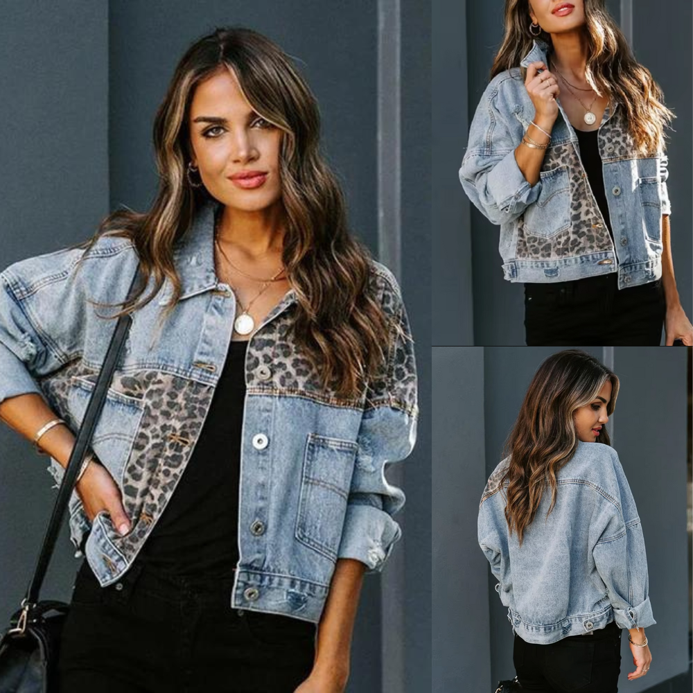 Dale vida a tu colección de prendas exteriores con esta cazadora vaquera de manga larga para mujer, que crea un llamativo contraste con su llamativo patchwork de leopardo. El abrigo de estilo europeo-americano combina el denim clásico con un toque salvaje, lo que lo convierte en un complemento llamativo para cualquier armario. La chaqueta es perfecta para llevar a capas y puede combinarse sin esfuerzo con todo, desde vaqueros informales hasta vestidos elegantes, dando a tu look un toque fuera de lo común.
